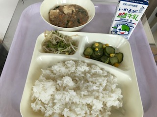 マーボーどうふ・きゅうりとコーンの甘酢あえ・もやしとピーマンのごまいため・ごはん・牛乳