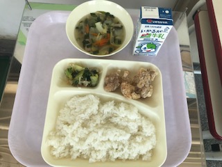 鶏肉のからあげ・中華スープ・チンゲンサイともやしの甘酢あえ・ごはん・牛乳