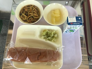 カレースープスパゲッティ・キャベツのピクルス・りんご・パン・牛乳