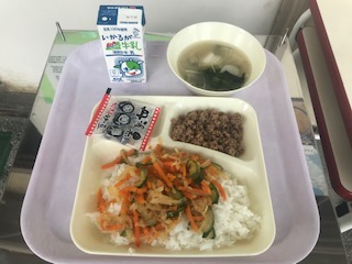 ビビンバ・トック・いり黒豆・ごはん・牛乳