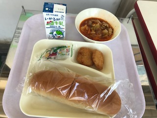 一口とんかつ・ミネストローネ・豆こんぶ・パン・牛乳