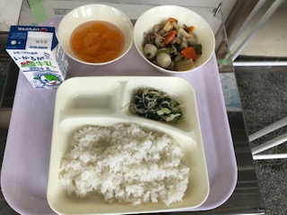 八宝菜・チンゲンサイともやしのしょうがあえ・みかん・ごはん・牛乳