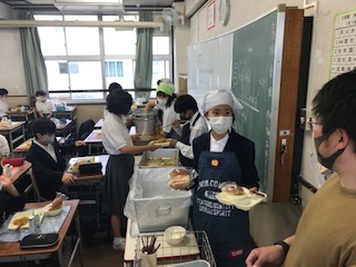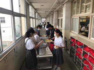 1年生の配膳の様子です。1年生も明日から3日間給食なしになります。