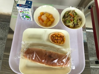 豚肉と野菜のカレースープ煮・変わりピザ・ミックスフルーツ・パン・牛乳