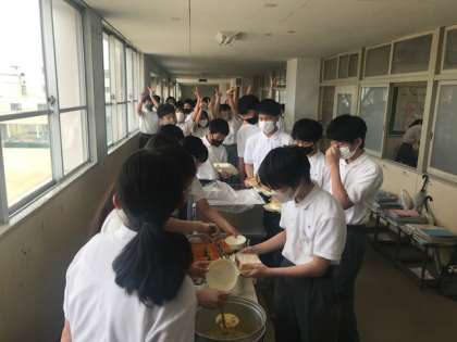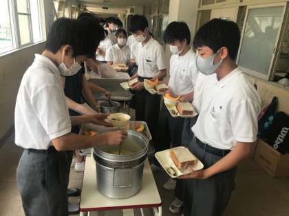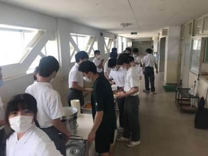 3年生の給食の様子です。実力テストは、あと1教科です。がんばってください。
