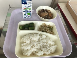 すき焼き煮・オクラのかつお梅風味・もやしとピーマンのごまいため・ごはん・牛乳