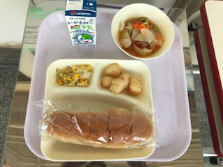 いかてんぷら・フレッシュトマトのスープ煮・サワーソテー・パン・牛乳