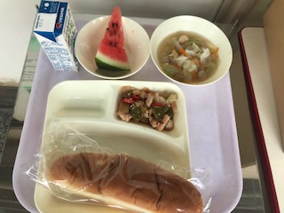 鶏肉と夏野菜のソテー・押麦のスープ・すいか・パン・牛乳