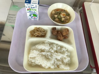 豚肉の香味あげ・みそ汁・もやしのおひたし・ごはん・牛乳