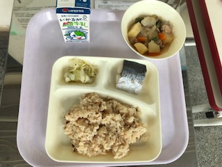 さごしの塩焼き・豚肉とじゃがいもの煮もの・キャベツの梅風味・かやくごはん・牛乳