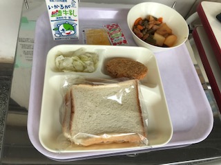 チキンレバーカツ・ケチャップ煮・キャベツのバジル風味サラダ・パン・牛乳
