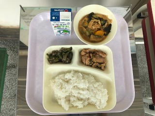 焼きとり・みそ汁・なすのそぼろ炒め・ごはん・牛乳