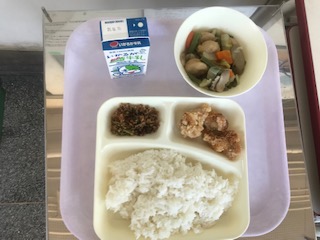 鶏肉のたつたあげ・一口がんもと野菜の煮物・おかかなっ葉・ごはん・牛乳