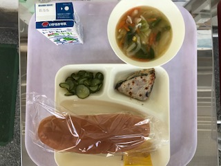 かつおのマリネ焼き・鶏肉とじゃがいものスープ・きゅうりのサラダ・パン・牛乳