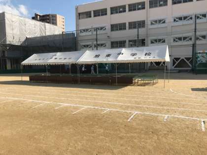 明日の体育大会では、北門(内環側)を通用門とします。受付で、来場者健康状態確認書を提出し、入校証を提示して、名簿に○をつけてお入りください。また自転車は、体育館の敷地内に止めてください。開門予定は8時45分です。よろしくお願いします。