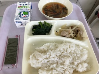 鶏肉のゆず塩焼き・ソーキ汁・ほうれんそうのおひたし・ごはん・牛乳