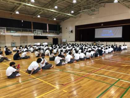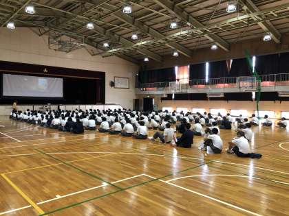 1年生は5/6限体育館に入って、全体で平和学習に取り組んでいます。これはDVDを鑑賞している様子です