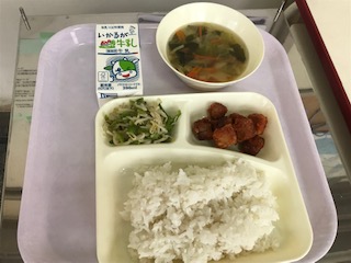 まぐろのオーロラ煮・すまし汁・もやしとピーマンのいためもの・ごはん・牛乳