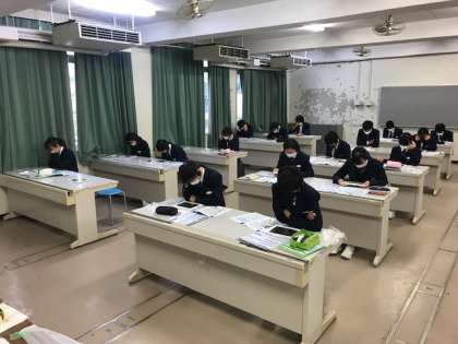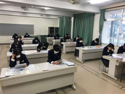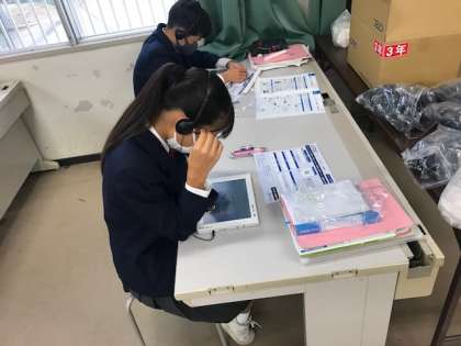 3年3組のスピーキングテストの様子です。生徒一人一人が、パソコンのマイクに向かって英語で応答しています