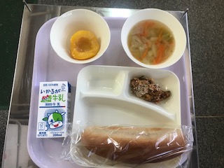 なすのミートグラタン・鶏肉と野菜のスープ・黄桃・パン・牛乳
