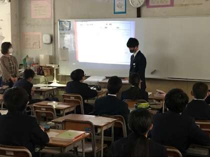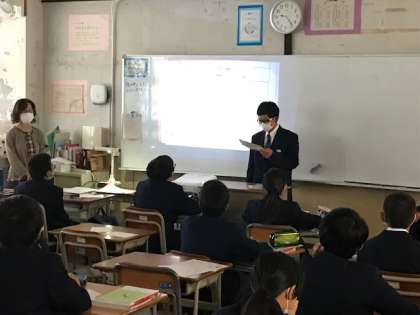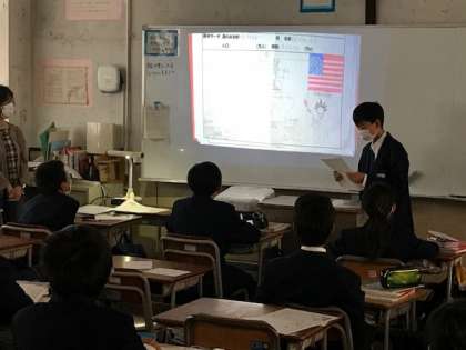 1年2組の社会です。一人一人前に立って、国調べの発表をおこなっています。