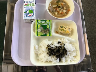 千草焼き・みそ汁・ごまひじき・抹茶大豆・ごはん・牛乳