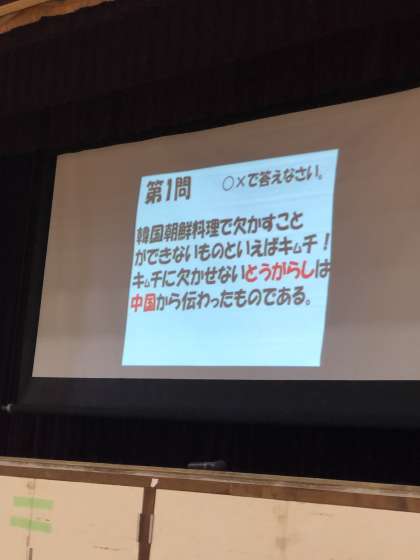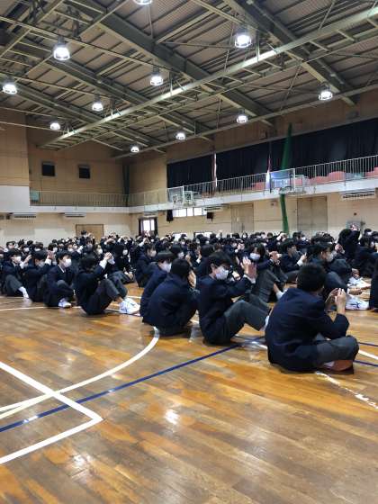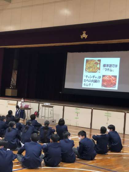 1年生は、2/3時間目に体育館で、在日外国人問題学習に取り組んでいます