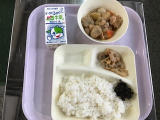 関東煮・れんこんの梅風味焼き・のりのつくだ煮・ごはん・牛乳