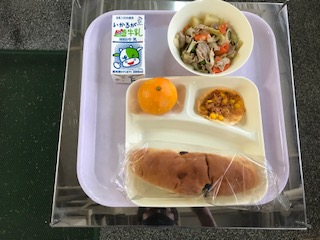 豚肉と野菜のスープ煮・変わりピザ・みかん・パン・牛乳