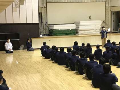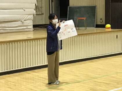 3年生の学年集会です。将来の職業について、図を使って解説しています。1/2年の集会は天候不良のため、中止となりました。