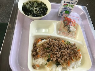 ビビンバ・わかめスープ・アーモンドフィッシュ・ごはん・牛乳