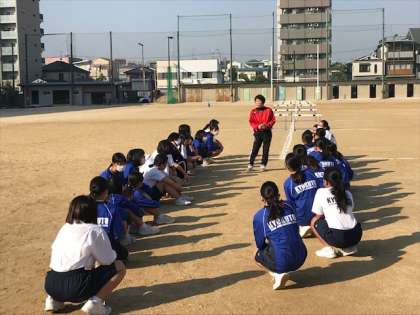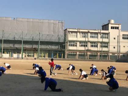 1年3/4組の女子体育、今週からグランドでハードルの授業です。雲一つない空の下で行われています。