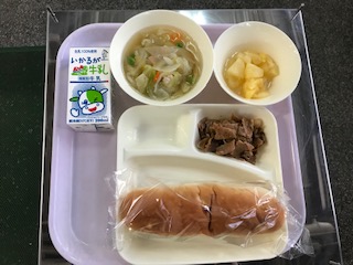 豚肉のデミグラスソース・スープ・パインアップル・パン・牛乳