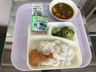 えびフライカレーライス・ブロッコリーのサラダ・ソフト黒豆・ごはん・牛乳