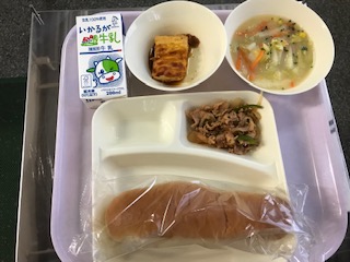 豚肉のケチャップソテー・コーンスープ・焼きプリン・パン・牛乳