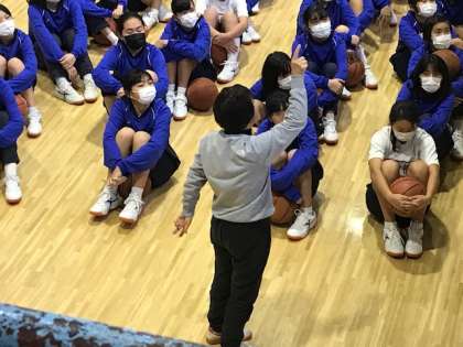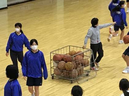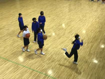 1年1/2組の女子体育です。集会室でバスケットボールをしています。