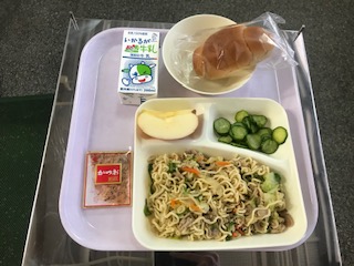 和風やきそば・きゅうりのしょうがづけ・りんご・パン・牛乳