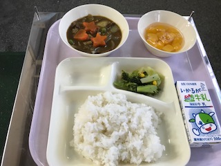 冬野菜のカレーライス・ブロッコリーとコーンのサラダ・黄桃・ごはん・牛乳