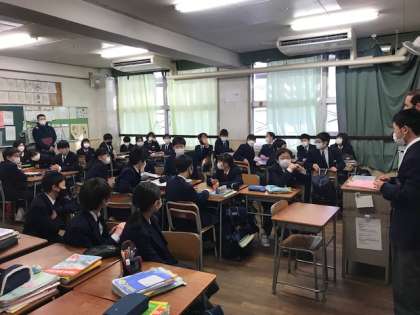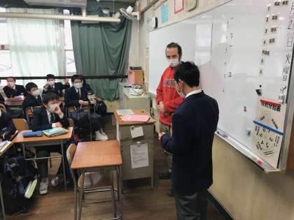 1年3組の英語、C-NETの先生と班対抗で英語ジェスチャーゲームをしています