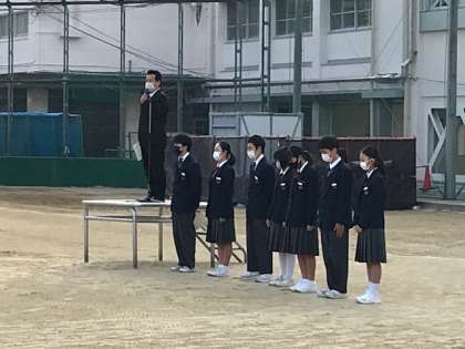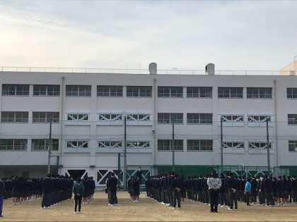 市内中学校11校が休校となっている週の初日、旭東中は朝から全校集会を行っています。寒い中、みんな元気です。