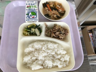豚肉のごまだれ焼き・みそ汁・きくなとはくさいのおひたし・ごはん・牛乳