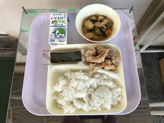 鶏肉のからあげ・まる天と野菜のうま煮・焼きのり・ごはん・牛乳