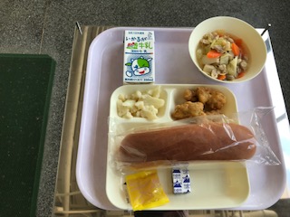 白身魚フリッター・洋風煮・カリフラワーのサラダ・パン・牛乳