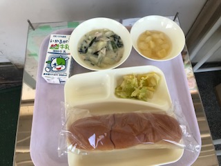 ほうれんそうのクリームシチュー・キャベツのサラダ・洋なし・パン・牛乳