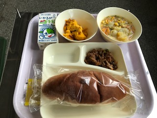 牛肉のデミグラスソース煮・コーンスープ・かぼちゃのプリン・パン・牛乳