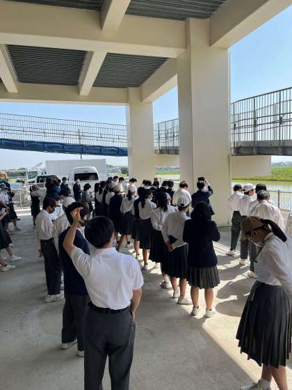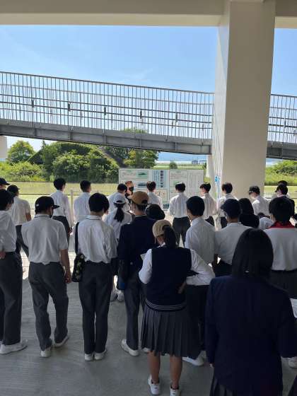 ・掩体見学でガイドの方にお話を聞いています。(平和学習)