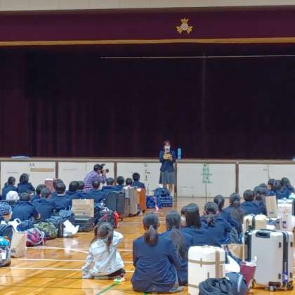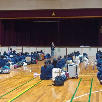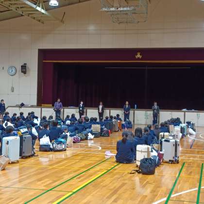 ・予定より40分程遅れましたが無事帰校しました。帰校式の様子です。