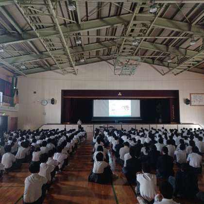 ・今日は、警察の方に来校していただき、体育館で非行防止・薬物乱用防止教室を実施しました。みんな真剣に聞いていました。