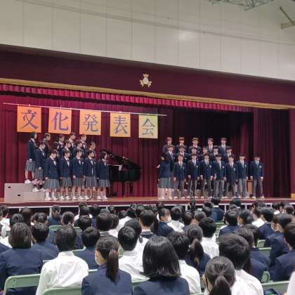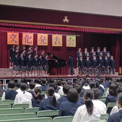 ・文化発表会の舞台発表の様子です。各学年の音楽コンクールの優勝クラスが合唱しています。