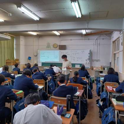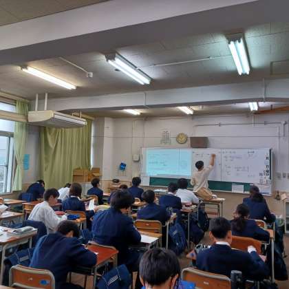 ・今日は、大阪市教育委員会の方に来校していただき、1年1組で数学の研究授業を行いました。